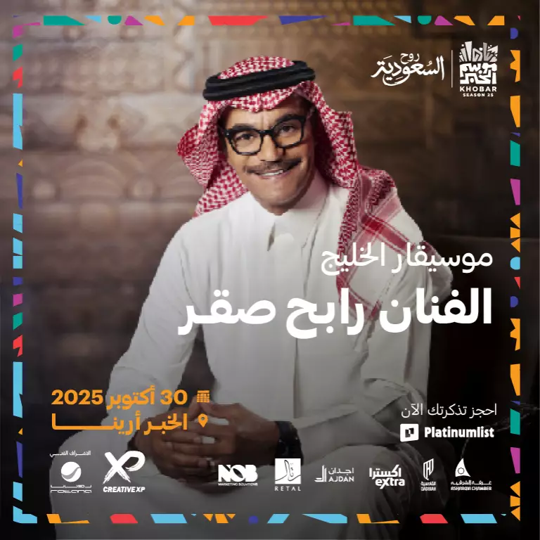 ومن المقرر أن يقام حفل رابح صقر يوم الخميس 30 أكتوبر 2025 في مدينة الخبر. الساحة. وستفتح أبواب المكان عند الظهر 8:00 مساءًوسيبدأ التقديم الرسمي في تمام الساعة الواحدة بعد الظهر 10:00 مساءاويستمر لمدة ساعة تقريبا 12:30 بعد منتصف الليل.